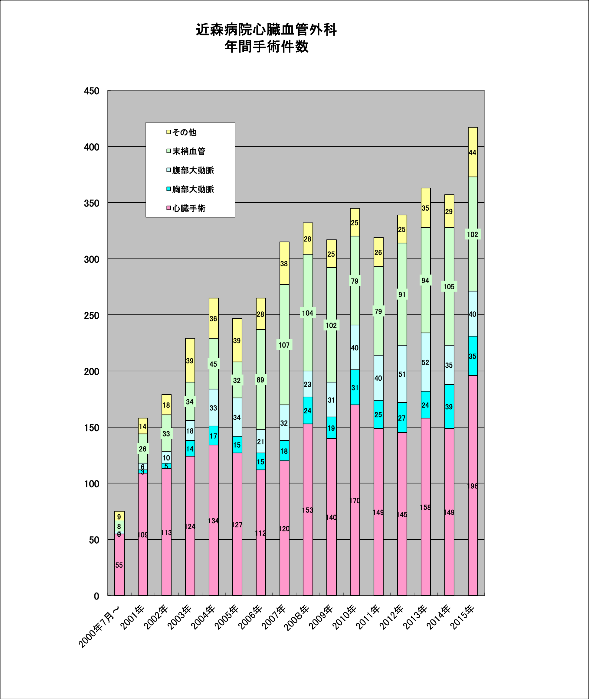 DPCの症例数は上記となりますが、同一期間に行われた当科の手術の内訳を見てみますと、冠動脈バイパスおよび弁膜症手術を含む心臓手術が197例、胸部大動脈手術が37例、腹部大動脈手術が46例、末梢血管手術が114例でした。(2015/4〜2016/3抽出データ)