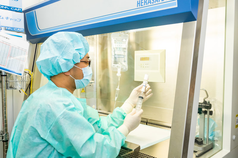 - 専用室のすぐ隣に薬剤調整室を備え、医師から化学療法オーダーが入り次第、直ぐに薬剤師が薬剤を無菌的調剤し、患者さんをお待たせすることがありません。