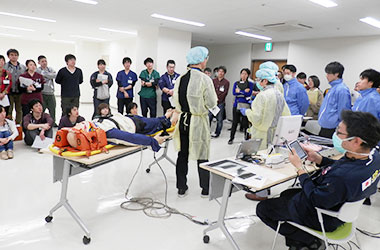 JATEC(外傷初期診療プログラム)、JPTEC(病院前外傷救護)、DMAT(災害医療支援チーム)研修など各種のコースに、救急科医師を中心に講師、受講者として積極的に参加し日々研鑽を積んでいます。