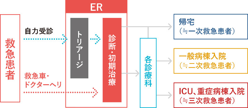 軽症から重症まですべての患者さんを受け入れ、その緊急度・重症度を即時に判断した上で治療にあたる救急医療体制です。これまでの、受け入れ側の医療機関の立場から考えられた、一次、二次、三次救急という日本独自の救急医療体制とは異なり、1996年にNHKの医療系ドラマ『ER 緊急救命室』が放送されて以来、日本でも注目されるようになりました。