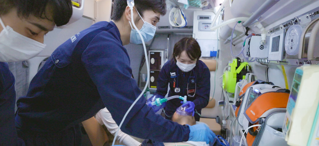 2007年6月から重症患者さんへの一刻も早い接触を目的に、医師同乗による現場出動や病院間搬送、遠方の消防機関との中継搬送などを行っています。また、2018年4月からは全日日勤帯へとその対応範囲を広げています。