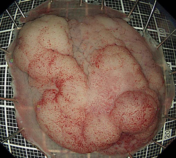 切除標本です。筋層直上で切除しているので、病理学的評価が詳細に行え、根治度の判定が正確に行えます。