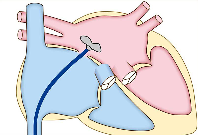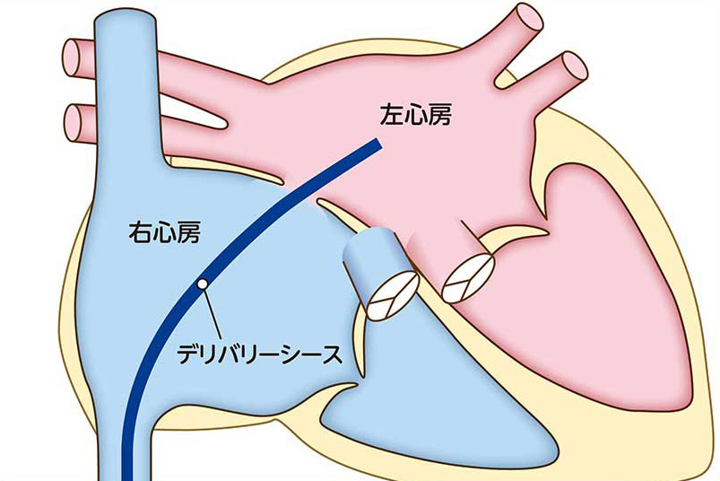 鼠径部(太ももの付け根)の静脈からカテーテルを通して、閉鎖栓デバイスを心臓に挿入。