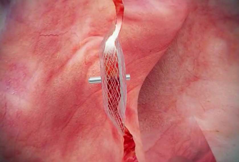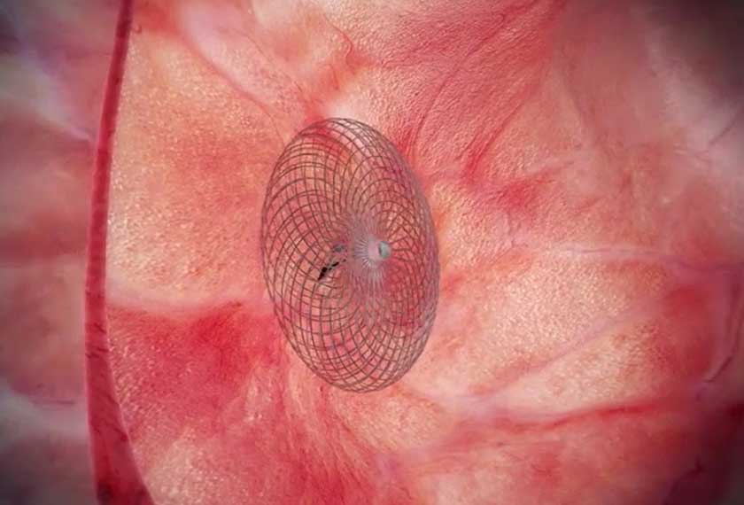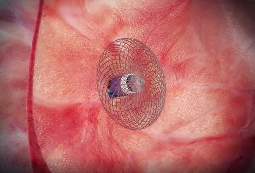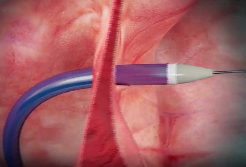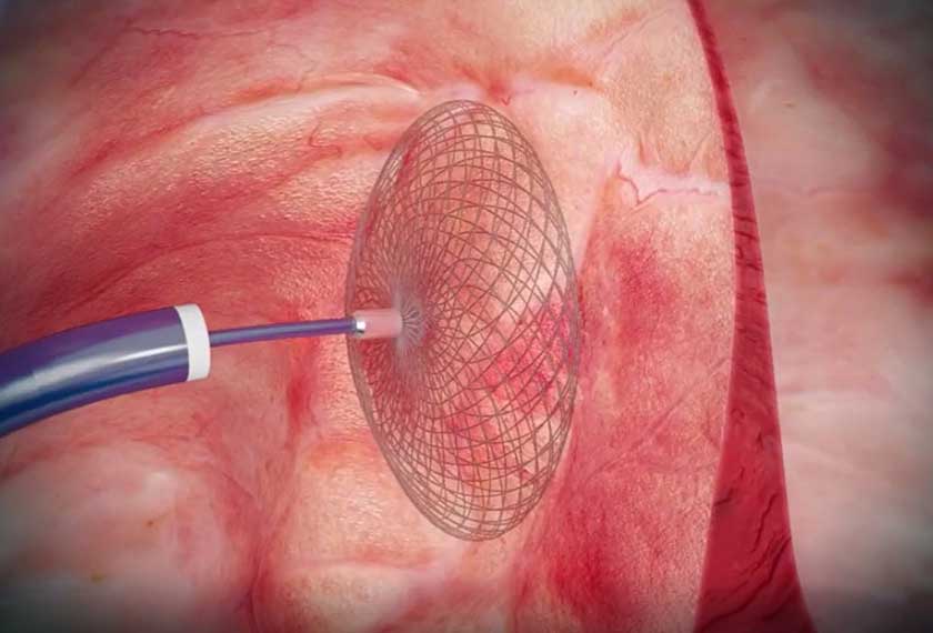 続いてデリバリーカテーテルを右心房側に移動させて、もう一方の閉鎖栓を展開することにより卵円孔開存(PFO)を閉鎖。