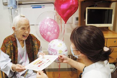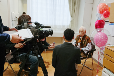 99歳11か月の患者さんが心臓血管外科手術を受けられ、本日元気に退院されました。同様の開胸手術を受けられた方の中では、過去最高齢となります。退院直前に100歳を迎えられたこともあり、多くのメディア取材も受けられました。