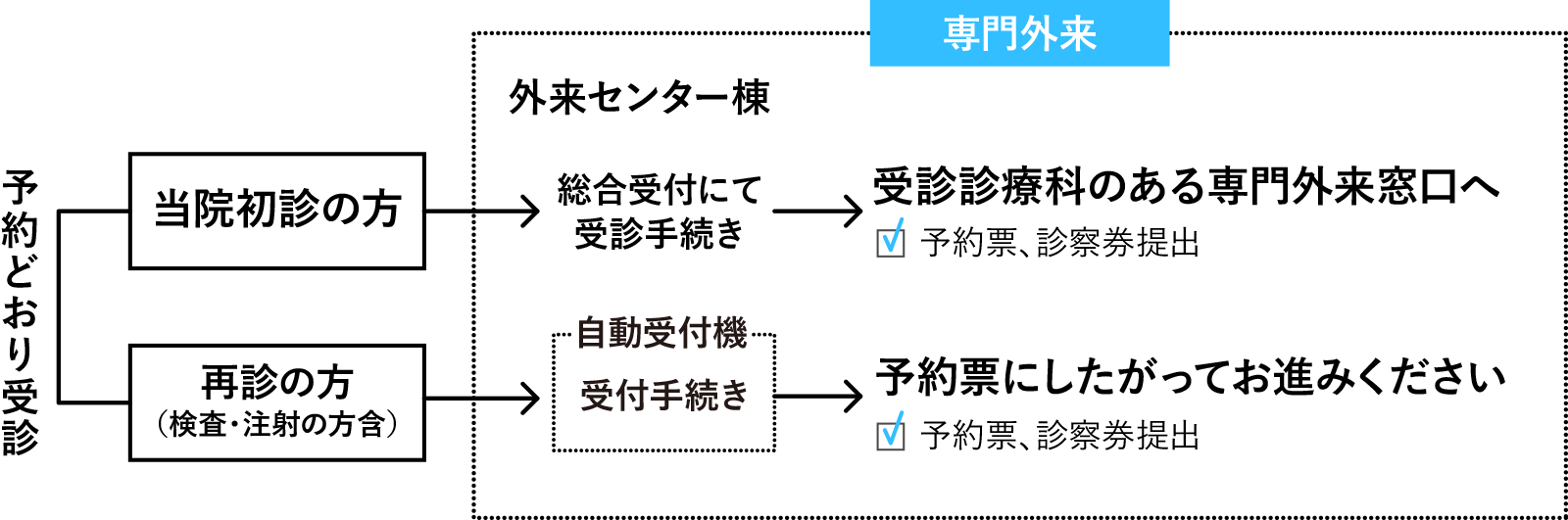 当院の外来は紹介予約制の専門外来となっており、受診には紹介状と事前予約が必要です。地域の病院、診療所を受診の上、さらに精密な検査が必要な場合や手術、入院が必要と思われる場合には当院の専門医が診療させていただきますので、紹介状をお持ちの上ご来院ください。