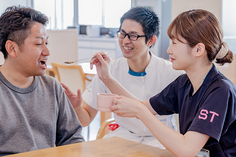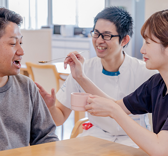 近森リハビリテーション病院では、ひとりひとりの日常動作の自立にむけ、多職種による患者中心のチーム医療を行っています。